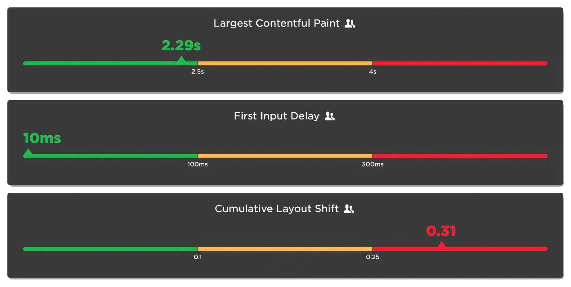 - First Input Delay (FID) tracks how quickly the site responds to a user’s initial interaction, with an ideal FID under 100 milliseconds.